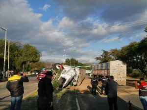 Se trató de un tráiler con caja seca en color blanco que circulaba a exceso de velocidad, por lo que perdió el control de su unidad en la curva y apesar de que intentó evitar el accidente, no logró su objetivo, quedó recostada sobre su lateral izquierdo con daños materiales importantes además que la vialidad se vió afectado el camellón, la carpeta asfáltica y jardines.
