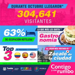 La capital poblana se consolida como sitio turístico de referencia a nivel nacional e internacional, esto tras la llegada de más de 300 mil visitantes tan solo en el pasado mes de octubre, lo que representa que en ningún mes desde 2012 se había alcanzado esa cifra.Con base en el Sistema Nacional de la información estadística del Sector Turismo de México (Datatur), se registró la llegada de 304 mil 641 visitantes, además hubo una ocupación hotelera del 63 por ciento, lo que coloca a la ciudad de Puebla en el top de los lugares más visitados en el presente año, siendo el Zócalo el lugar que registra mayor número de asistentes.Cabe señalar que los principales destinos internacionales de procedencia son: Colombia, España, Estados Unidos, Alemania, Austria, Brasil, Polonia y Hungría; de igual forma las y los visitantes nacionales más comunes son de Ciudad de México, Oaxaca, Tlaxcala, Nuevo León y Jalisco.En diciembre de 2021, la prestigiosa Revista de viajes Condé Nast Traveler, dio a conocer que Puebla se encuentra en la “Gold List”, una lista de los principales nueve destinos del mundo para conocer y visitar durante el 2022.